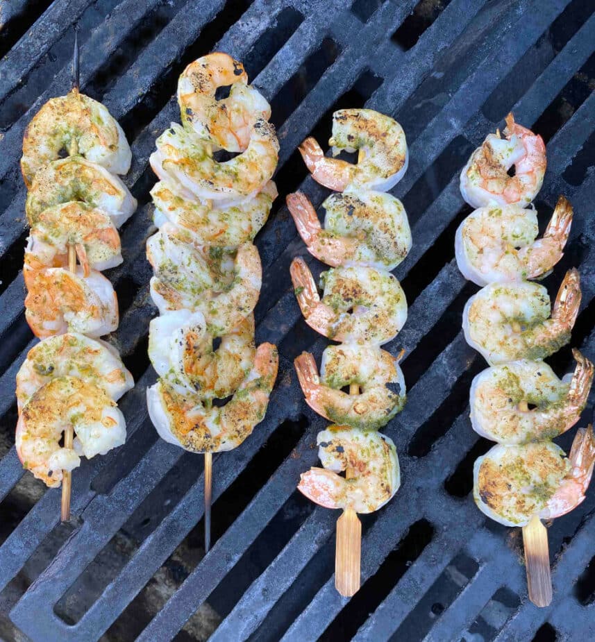 - Thread 5 – 6 shrimp on each skewer. Brush with pesto if needed.